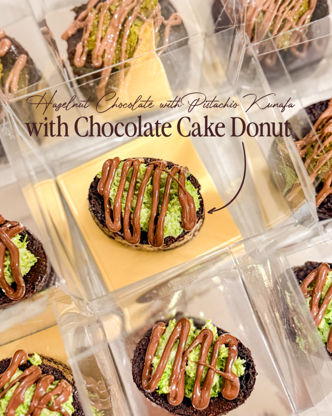 Our rich cake donut is filled with indulgent kunafa (flavor of your choice), combining moist cake with crunchy, buttery kunafa strands and nutty goodness. Finished with a drizzle of silky chocolate, each bite delivers the perfect balance of creamy sweetness and crisp texture.
